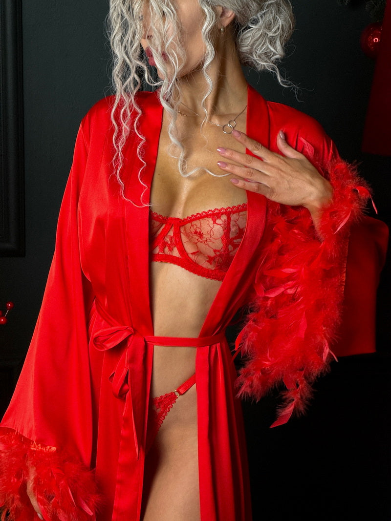 Розкішний довгий халат, створений з гладкого шовкову глибокого червоного кольору. Лінія декольте делікатно виражена , що додає образу грайливої жіночності. Рукави прикрашені пухнастим пір’ям, яке створює атмосферу ніжності та справжнього новорічного чару.