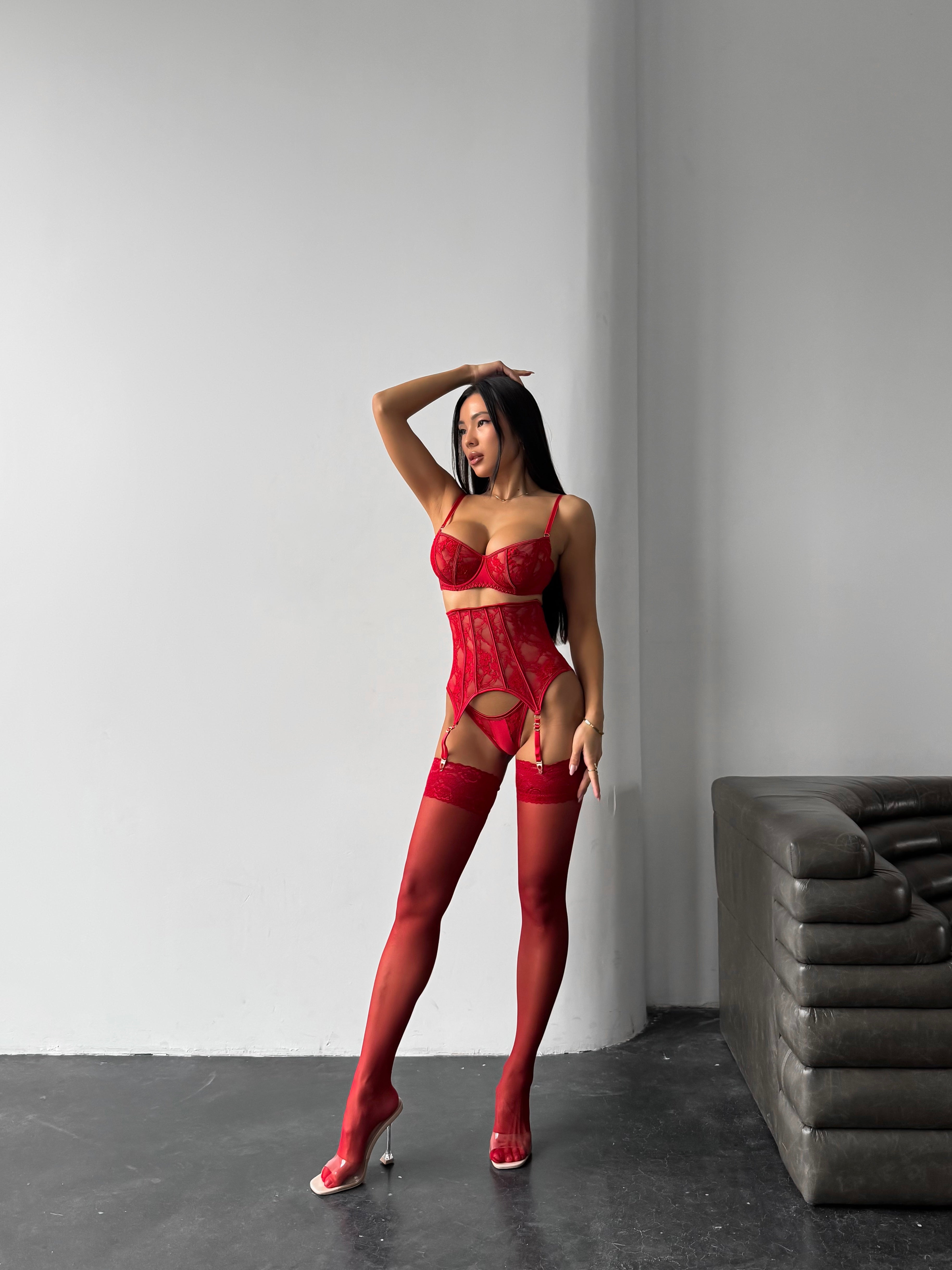Насичений червоний відтінок мережива створює глибокий, магнетичний образ.Червоний сатин додає виразності .